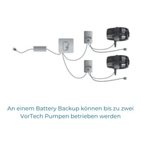 VorTech Strömungspumpen können direkt an das Battery Backup angeschlossen werden. Optional lassen sich bis zu zwei VorTech Pumpen gleichzeitig betreiben.