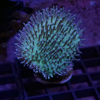 Zoanthus 'Johnny Pumpkin', Caulastrea, Eunicea-Gorgonia, Cyphastrea decadia 'Red', Favia 'Mystic Grape', Zoanthus 'Green Goblin', Goniastrea 'Baby Blue Eye', Sarcophyton 'Light Green', Acanthastrea 'Explosion' and Sinularia brassica.