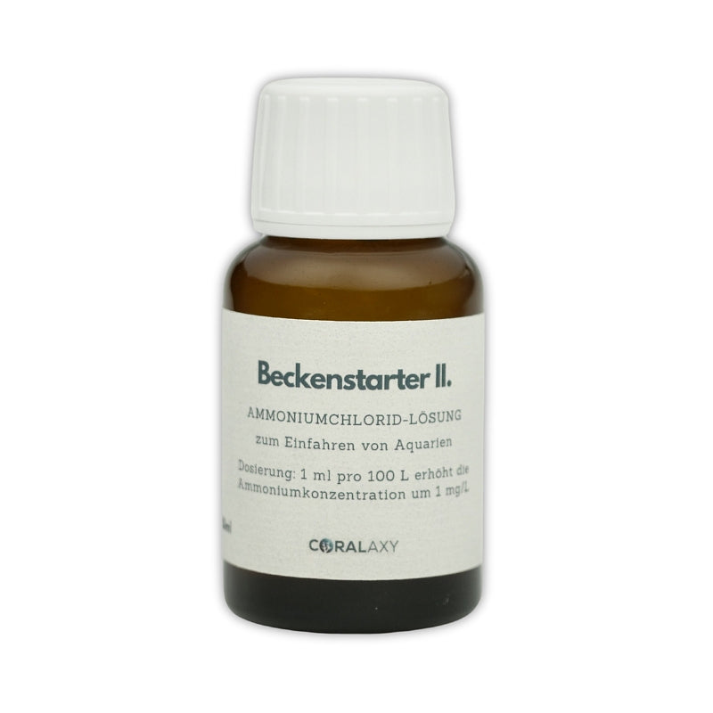 Beckenstarter 2 ist Deine gezielte Stickstoffquelle zum kontrollierten Einfahren von Meer- oder Süßwasseraquarien. Die Lösung enthält reines Ammoniumchlorid und wurde speziell für die Anwendung zusammen mit Starterbakterien wie unserem Beckenstarter 1 (für Meerwasseraquarien) entwickelt. Durch die simulierte Belastung mit Ammonium entsteht eine realitätsnahe Umgebung, in der sich nitrifizierende Bakterien gezielt aufbauen können – ganz ohne Fischbesatz, Futter oder unnötige Risiken.